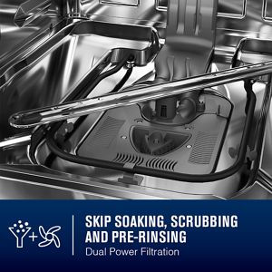 - Skip soaking, scrubbing and pre-rinsing with Maytag engineering that puts an end to pre-work. Industry-exclusive Dual Power Filtration combines 100% microfiltration and a 4-blade stainless steel chopper to filter out then dispose of any food in its path.